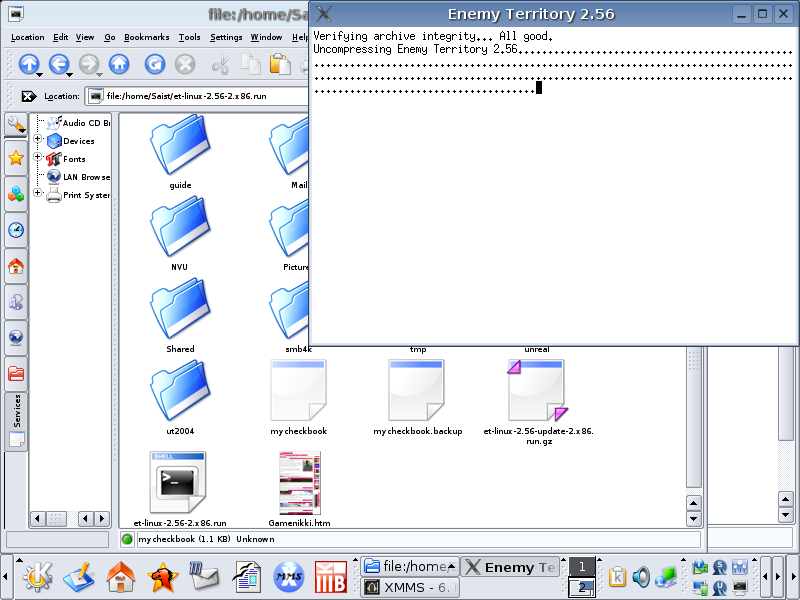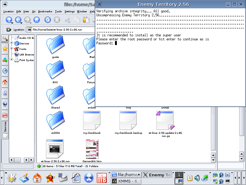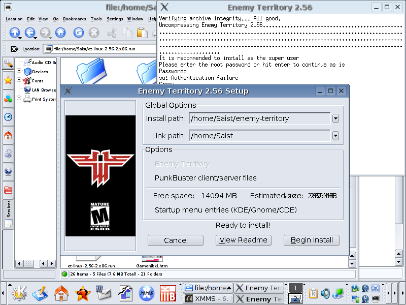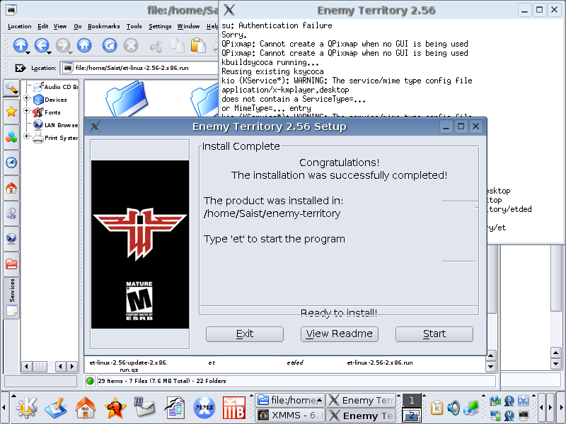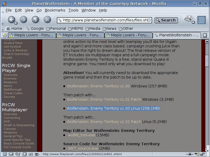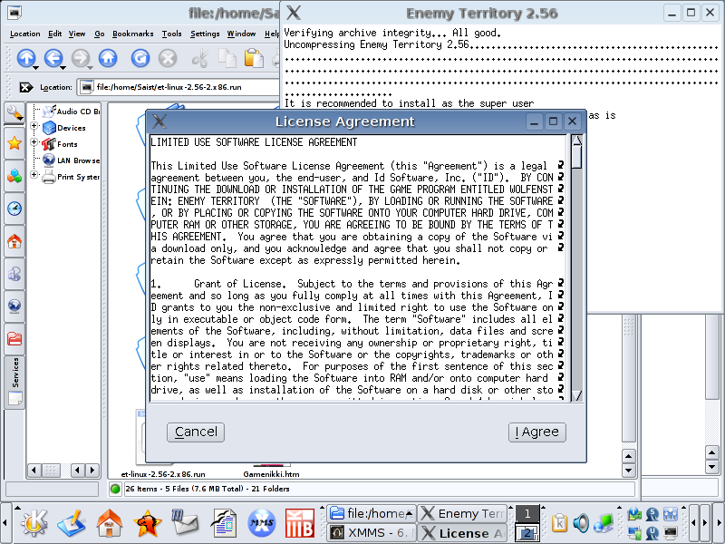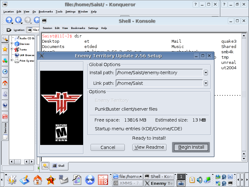 Enemy Territory, a free expansion for RTCW. This guide will use both command prompt and GUI (graphic user interface) functions to install Enemy Territory. 1: The first step in getting Enemy Territory, is Finding Enemy territory. For now, lets start out with Planet Wolfenstein's page ![]() 2: Go ahead and enter the Essential Files link ![]() 3: As we move down the page, the link to the Linux install file should appear. ![]() 4: Once on Fileplanet, go ahead and download the Enemy Territory Client. ![]() 5: While suffering through the long wait to download the game client, return to the Planet Wolfenstein page and look for the Enemy Territory Patch. ![]() 6: At this point it is simply a matter of waiting on FilePlanet to make the downloads available. Also, doesn't look too much time was wasted as Q3A is getting a file workout. ![]() 7: Whenever Fileplanet gets around to saying it is alright to download the files, simply save the files to the /home/(username) location. Mozilla defaults to this location. ![]() 8: Once the update file pops up ![]() 9: Save it to /home/(username) as well. ![]() 10: Now both files should be in the Personal Files folder. Go ahead and click on the file that is labeled et-linux-2.56-2.x86.run ![]() 11: After clicking on the run file, the Enemy Territory installer should pop up. ![]() 12: Enemy Territory should ask to switch to root. Do Not Switch. Go ahead and just hit Enter to remain in the User mode. ![]() 13: At this point the Enemy Territory installer will ask for a license agreement. Hit I agree ![]() 14: Hit I agree again to accept Punkbuster. ![]() 15: Enemy Territory defaulted to installing into the /home/(username) folder. If Enemy Territory has something else in the paths, simply set Install path: /home/(username)/enemy-territory Link Path: /home/(username) Then hit the Begin Install button. ![]() 16: Don't worry about text corruption during the install. ![]() 17: Now Enemy Territory has completed. Hit Exit ![]() 18: Now its time to look at the other downloaded file et-linux-2.56-update-2.x86.run.gz ![]() 19: Click on et-linux-2.56-update-2.x86.run.gz ![]() 20: Ark should open. ![]() 21: Click on the extract button. ![]() 22: Ark will probably be set to the last location it was used to download to. Hit the blue folder icon to open up the file browser and return to /home/(username) and then hit okay. ![]() 23: Now Ark's extract to line should read /home/(username) ![]() 24: Hit the ok button and wait for Ark to finish. Once the patch has been extracted, simply close the Ark program. ![]() 25: There should now be a file labeled et-linux-2.56-update-2.x86.run ![]() 26: Time to open up Konsole. Currently Konsole is in Most Used Applications. It is also under system in the K-menu ![]() 27: Once Konsole is open, type dir ![]() 28: The purpose of typing the directory command is simple. To make sure the file that is needed is in the folder Konsole is currently in. Type in :: sh et-linux-2.56-update-2.x86.run ![]() 29: The Update should open and ask to switch to root mode. DO NOT SWITCH. Hit Enter to continue the install in user mode. ![]() 30: A punkbuster agreement should appear. Hit i agree ![]() 31: Make sure the install path and link path are identical to the last time, then hit begin install ![]() 32: Once the install finishes, hit exit. ![]() 33: Go ahead and close Konsole. ![]() 34: Now to turn attention back to Personal Files which should have a new folder labeled Enemy-Territory inside. Open the folder. ![]() 35: Inside is a shell script labeled et. Go ahead and create a desktop link by dragging the file onto the desktop. ![]() 36: Choose link here on the release. ![]() 37: Now there is a desktop link. Does it work? ![]() 38: Get the frag on. ![]() ![]() |