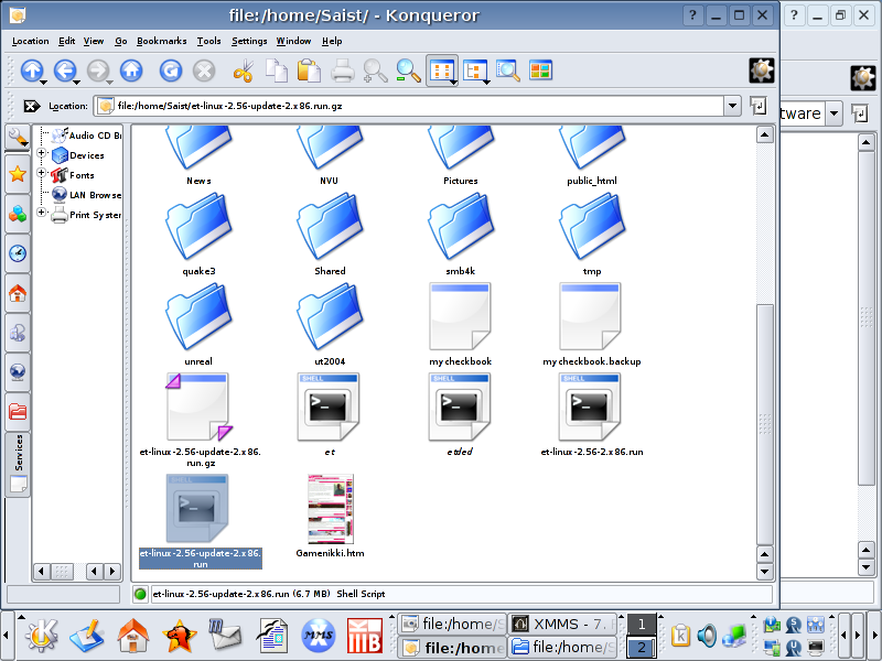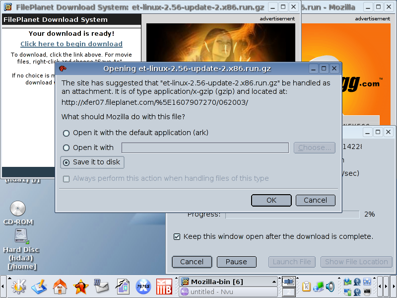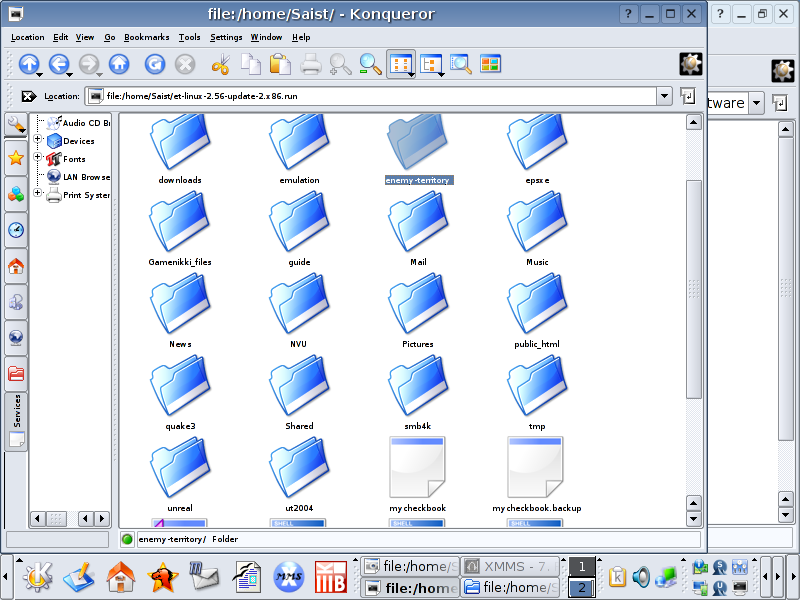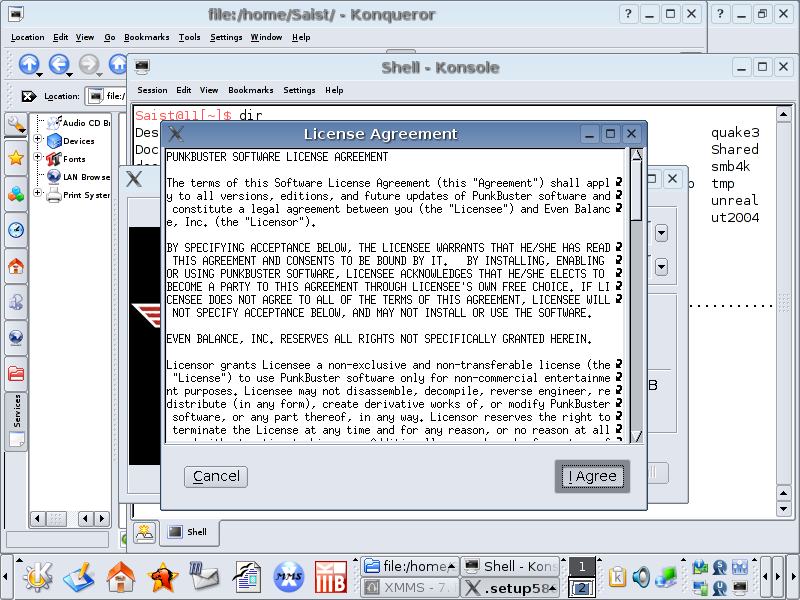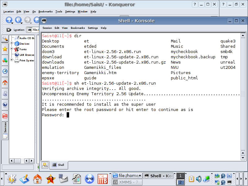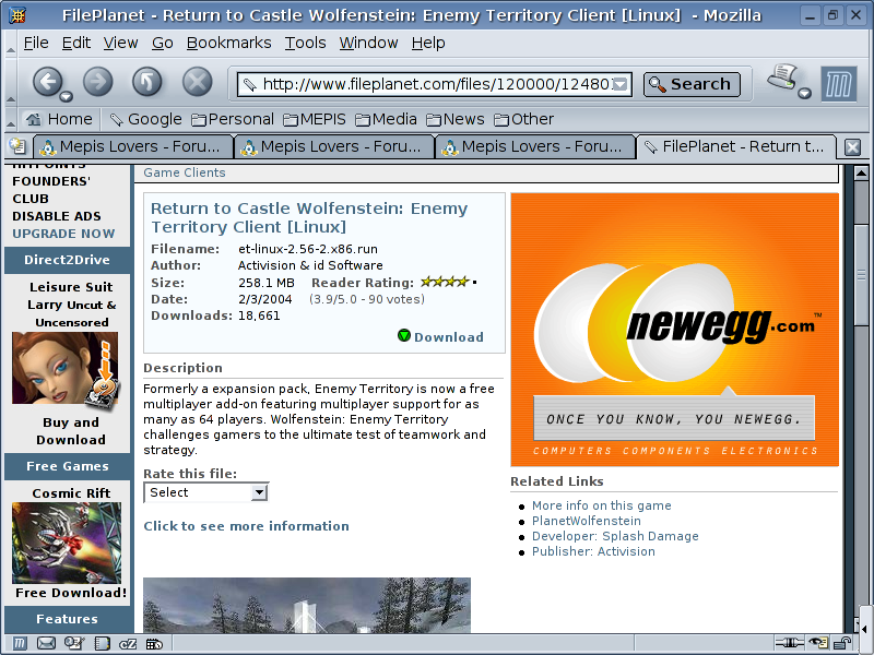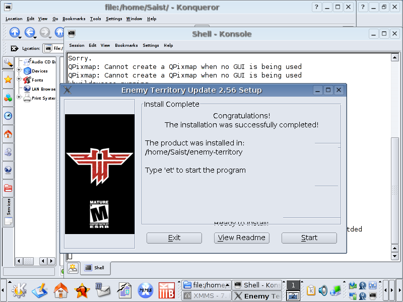 Enemy Territory, a free expansion for RTCW. This guide will use both command prompt and GUI (graphic user interface) functions to install Enemy Territory. 1: The first step in getting Enemy Territory, is Finding Enemy territory. For now, lets start out with Planet Wolfenstein's page ![]() 2: Go ahead and enter the Essential Files link ![]() 3: As we move down the page, the link to the Linux install file should appear. ![]() 4: Once on Fileplanet, go ahead and download the Enemy Territory Client. ![]() 5: While suffering through the long wait to download the game client, return to the Planet Wolfenstein page and look for the Enemy Territory Patch. ![]() 6: At this point it is simply a matter of waiting on FilePlanet to make the downloads available. Also, doesn't look too much time was wasted as Q3A is getting a file workout. ![]() 7: Whenever Fileplanet gets around to saying it is alright to download the files, simply save the files to the /home/(username) location. Mozilla defaults to this location. ![]() 8: Once the update file pops up ![]() 9: Save it to /home/(username) as well. ![]() 10: Now both files should be in the Personal Files folder. Go ahead and click on the file that is labeled et-linux-2.56-2.x86.run ![]() 11: After clicking on the run file, the Enemy Territory installer should pop up. ![]() 12: Enemy Territory should ask to switch to root. Do Not Switch. Go ahead and just hit Enter to remain in the User mode. ![]() 13: At this point the Enemy Territory installer will ask for a license agreement. Hit I agree ![]() 14: Hit I agree again to accept Punkbuster. ![]() 15: Enemy Territory defaulted to installing into the /home/(username) folder. If Enemy Territory has something else in the paths, simply set Install path: /home/(username)/enemy-territory Link Path: /home/(username) Then hit the Begin Install button. ![]() 16: Don't worry about text corruption during the install. ![]() 17: Now Enemy Territory has completed. Hit Exit ![]() 18: Now its time to look at the other downloaded file et-linux-2.56-update-2.x86.run.gz ![]() 19: Click on et-linux-2.56-update-2.x86.run.gz ![]() 20: Ark should open. ![]() 21: Click on the extract button. ![]() 22: Ark will probably be set to the last location it was used to download to. Hit the blue folder icon to open up the file browser and return to /home/(username) and then hit okay. ![]() 23: Now Ark's extract to line should read /home/(username) ![]() 24: Hit the ok button and wait for Ark to finish. Once the patch has been extracted, simply close the Ark program. ![]() 25: There should now be a file labeled et-linux-2.56-update-2.x86.run ![]() 26: Time to open up Konsole. Currently Konsole is in Most Used Applications. It is also under system in the K-menu ![]() 27: Once Konsole is open, type dir ![]() 28: The purpose of typing the directory command is simple. To make sure the file that is needed is in the folder Konsole is currently in. Type in :: sh et-linux-2.56-update-2.x86.run ![]() 29: The Update should open and ask to switch to root mode. DO NOT SWITCH. Hit Enter to continue the install in user mode. ![]() 30: A punkbuster agreement should appear. Hit i agree ![]() 31: Make sure the install path and link path are identical to the last time, then hit begin install ![]() 32: Once the install finishes, hit exit. ![]() 33: Go ahead and close Konsole. ![]() 34: Now to turn attention back to Personal Files which should have a new folder labeled Enemy-Territory inside. Open the folder. ![]() 35: Inside is a shell script labeled et. Go ahead and create a desktop link by dragging the file onto the desktop. ![]() 36: Choose link here on the release. ![]() 37: Now there is a desktop link. Does it work? ![]() 38: Get the frag on. ![]() ![]() |